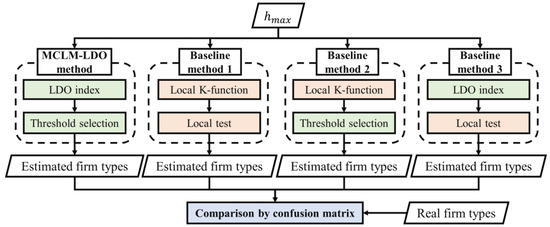 The evaluation scheme is shown in Figure 3. The MCLM-LDO method with three baseline methods is applied to two synthetic datasets separately to obtain estimated firm types at the global scale (i.e., inputting from the localization index curve) and uses real firm types as the reference to evaluate both in terms of efficiency and accuracy. The efficiency indicator uses the computation time, and the accuracy adopts three indicators from the confusion matrix. denotes the rate of the number of core firms (i.e., the firms in clusters) correctly estimated to the number of real core firms (Equation (8)); denotes the rate of the number of sparse firms (i.e., the firms beyond clusters) correctly estimated to the number of real sparse firms (Equation (9)); and denotes the rate of the number of firms correctly estimated to the total number of firms (Equation (10)). The larger the three indicators, the higher the accuracy of the method.