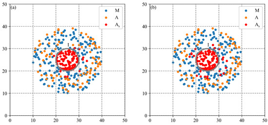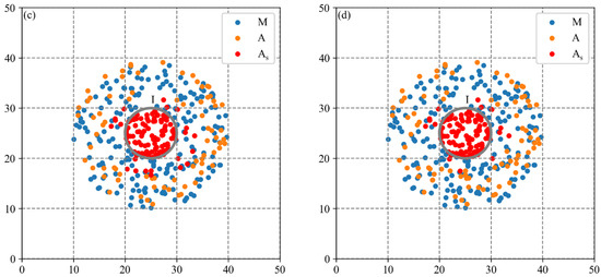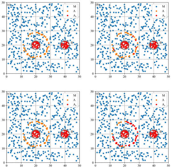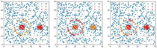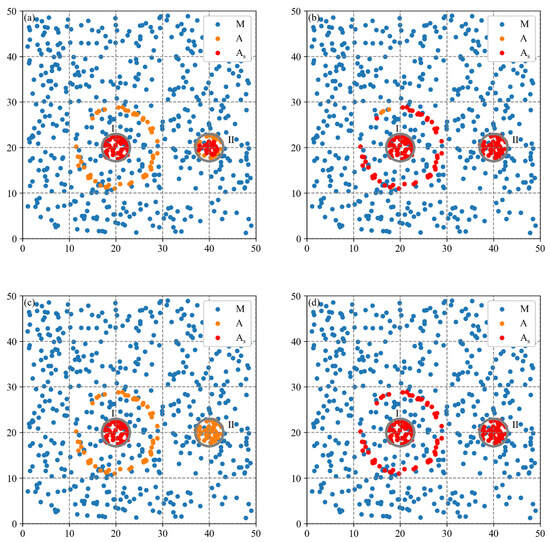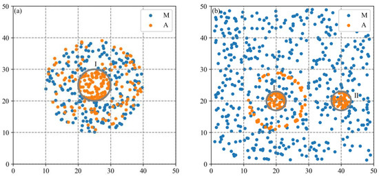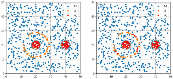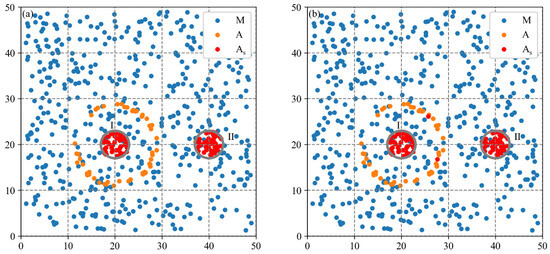 Synthetic Dataset 2 depicts an industrial spatial distribution of multiple clusters, with sparse firms at a distance from a cluster (Figure 4b). Both Cluster I and Cluster II have a scale of 6, each hosting 50 core firms of industry A. A ring, located 8 to 9 away from the center of Cluster I, accommodates 50 sparse firms of industry A. Moreover, industry M comprises 500 firms randomly distributed across the entire area.