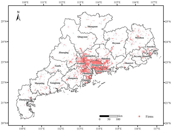 Spatial distribution of firms in the C39 industry in Guangdong Province, China, in 2022. Note that the Dongsha Islands of China are not shown considering that there are no firms.