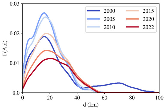 By inputting a sequence of distance thresholds [0 km, 1 km, …, 100 km] and to the DO index method, Figure 10 and Table 4 illustrate the evolution of agglomeration degrees for the C39 industry in Guangdong Province from 2000 to 2022. The of the C39 industry in Guangdong Province is consistently greater than 0 and the exceeds 45 km in all years, indicating that the industrial agglomeration at the large spatial scale persists from 2000 to 2022. By collectively analyzing , , and , the evolution of the spatial agglomeration patterns of the C39 industry in Guangdong Province can be preliminarily divided into three periods. The first period is from 2000 to 2005, where rises sharply from 0.58 to 0.68, with a moderate change in , reflecting rapid agglomeration of the industry and a stable spatial scale of agglomeration. The second period is from 2005 to 2015, where declines gradually from 0.68 to 0.58, while expands rapidly from 46 km to 57 km, signifying the start of industry dispersal and a noticeable growth in the spatial scale of agglomeration. The third period is from 2015 to 2022, where decreases dramatically from 0.58 to 0.38, with a small change in , indicating a rapid dispersion of the industry but a stable spatial scale of agglomeration.