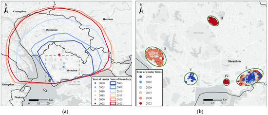 Figure 11 illustrates the evolution of cluster locations for the C39 industry in Guangdong Province from 2000 to 2022 obtained by using the MCLM-LDO method. On the global scale, the agglomeration boundary of the industry experienced a slight expansion in 2005. Subsequently, the boundary rapidly expanded outward from 2005 to 2015, centered around Shenzhen City, crossing the Pearl River in 2010. This formed a spatial agglomeration pattern of urban agglomerations with integrated development on the east and west coasts. After 2015, the boundary tended to stabilize, and the agglomeration center gradually moved closer to Dongguan City along transportation arteries. This implies a change in the industrial spatial agglomeration patterns inside the boundary, warranting further analysis.