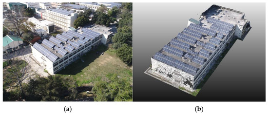 Images have been acquired using DJI Phantom 4 Pro, which comes with a pre-installed 20 MP FC360 camera in an oblique mode to cover the roof and the façade information of the building. Thirty-six images have been used for photogrammetric point cloud generation. Derivation of the photogrammetric point cloud was performed using an open-source software, ODM [45], to develop a dens point cloud for the scene. ODM is an open-source project developed to exploit the concept of structure from motion integrating various open-source algorithms (e.g., opensfm, matplot, etc.) for generating photogrammetric products such as orthophoto, digital elevation model or surface model, and point clouds from multi-view stereo images. Figure 4 shows the point cloud representation for the building reconstructed using the above-mentioned approach.