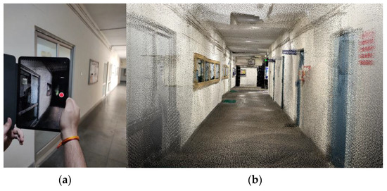 (a) Apple iPad Pro used for corridor scanning. (b) Corridor point cloud scanned through Apple LiDAR.