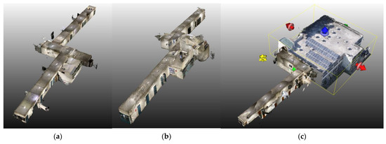 (a) Scan of the first-floor corridor. (b) Scan of the ground floor corridor. (c) Outdoor point cloud registered with indoor point cloud.