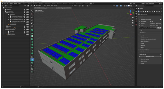 The geometric accuracy of the IFC model can be verified using the BlenderBIM Addon (an open-source software developed by the blender.org community as part of the IfcOpenShell project). BlenderBIM Addon is a professional-grade, free, and open-source platform specifically built for IFC creation. During the inspection, small discrepancies were noticed in the IFC file. For instance, the color and textures of the Revit BIM model were not preserved after exporting to IFC. Additionally, according to the IFC2X3 schema, certain components in the Revit model, such as “Solar Panels,” were exported as “IfcBuildingElementProxy” in the IFC file. The “Flat Roof” in the Revit model is classified as “IfcSlab” in the IFC model. All the elements in a CityGML are provided using the WGS1984 geographic coordinate system.