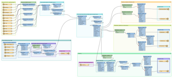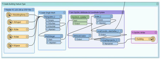 One initial step involves designing a building feature that defines the building’s outer structure at a specific site. The second reader uploads the IFC file in STEP/XML format. The transformers such as “Triangulator” and “MeshMerger” utilize features like “IfcSlab” and “IfcSpace” to generate a unified disaggregated mesh for the building. Once the mesh is generated, a coordinate system is assigned to it. The most recent update from FME (version 2022.1) introduces a new transformer called “CityGMLGeometrySetter”. This transformer simplifies the process of setting the CityGML schema description and role by offering a predefined list of options, making model transformation seamless. The transformer establishes the CityGML LOD name and role according to Open Geospatial Consortium (OGC) standards [39] and adheres closely to the naming convention. The focus is on adding the CityGML writer to the workspace to encompass the building’s exterior shell, while the rest of the features are saved as writer feature types. Figure 9 displays the workflow for creating a single building feature type.