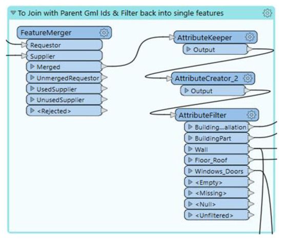 The building should have a parent-child relationship with its components. The “FeatureMerger” transformer is utilized to combine the geometry of one set of features with another using fundamental values and attributes. In Stage 2, the building’s outer shell is connected to the feature types created in Stage 1 through the join operation. Figure 10 shows how the parent GML IDs are linked with the element IDs of the building feature types. Adding various building features through the join allows the transformer “AttributeExposer” to selectively expose or choose only the necessary building features for the transformation process. The transformer is connected to the “AttributeFilter”, which directs feature types to different output ports depending on the attribute value. The output ports generate various writer feature types, which are then included in the main CityGML writer file.