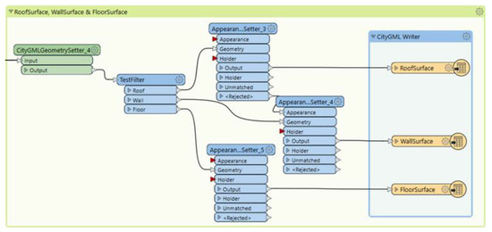 Every feature class is filtered using an individual output port. The classes include Building Installation, Building Parts, Roof Surface, Floor Surface, Wall Surface, Windows, and Doors. Connecting the building installation port to the “CityGMLGeometrySetter” transformer assigns the LOD name and role. The name assigned is “LOD3Geometry”, and its role is “outerBuildingInstallation”. The building feature type’s appearance or color is determined using the “AppearanceSetter” transformer. The feature type is connected to the writer, which adds converted features to the primary building writer. Continuing with the Building Parts, they are labeled as “LOD3MultiSurface” in CityGML with the role of “consistsOfBuildingPart”. Roof, wall, and floor surfaces need to be extracted, with the CityGML LOD name and its role being the standard of these features. The building is surrounded by these features, and a “TestFilter” transformer is used to filter features based on test conditions (a set of if-else statements) to segregate them at the output port. Testing conditions are utilized to filter roof, wall, and floor surfaces. The appearance of the extracted features is established similarly to that of building installations and building parts. Each of the three features is assigned a separate writer feature type (Figure 11).
