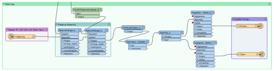 The proposed transformation workspace (Figure 8) is divided into five stages, each comprising a specific operation to complete the process. The five stages are the Grouping of IFC Features and Setting Coordinate System, Creating Building Feature Type, Joining with parent GML IDs and filtering into single features, CityGML property settings and conversion to writer feature type, and last, Extraction of Doors and Windows. Initially, two readers—IFC with Data Views and IFC as STEP/XML files—were added to the FME workspace. The former adds the different components of the building as individual elements, and the latter includes the exterior shell of the building.