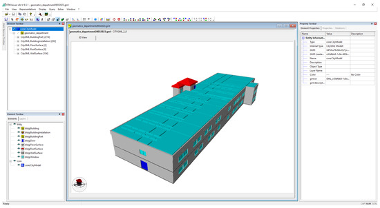 Geometric Validation Geometric validation is comprised of confirming the accuracy and completeness of the geometry in the CityGML model created during the conversion process. The geometric validation verifies the consistency and completeness of the resultant CityGML model obtained after the transformation process. In order to do this, the model was loaded and visualized into the FZK Viewer (Figure 13). Visualization would not be possible if the CityGML file is not valid.