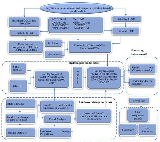 The Intergovernmental Panel on Climate Change Assessment Report (IPCC) [1,2] on climate change indicates that climate change will be accompanied by a rise in the frequency, severity, and duration of extreme natural phenomena such as excessive precipitation and extreme air temperatures in the twenty-first century. The trends suggest that the frequency and intensity of flood events are likely to rise globally due to climate and land use/cover changes attributed largely to urbanisation and anthropogenic activities [2,3]. Ding et al. [4] claimed that one of climate change’s most significant implications is the increased frequency and occurrence of severe weather conditions. As hydrological events are more prone to be frequent and extreme, it is becoming increasingly crucial to assess how hydrological events respond to future land use and climate conditions [5]. During extremes, an efficient and economical strategy for achieving situational awareness is essential to enhancing the management of emergency responses. The ability to forecast the occurrence and scale of extreme events is crucial for both infrastructure and emergency management.