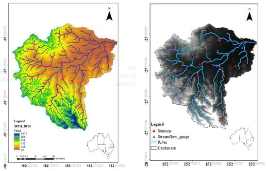 The study’s area geographical position in Australia (Left) and hydro-meteorological stations are taken into consideration throughout the catchment (Right).