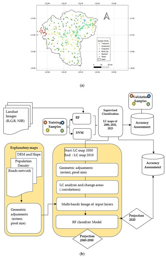 Land cover changes workflow chart (a) and spatial distribution of both training and validation polygons (b).