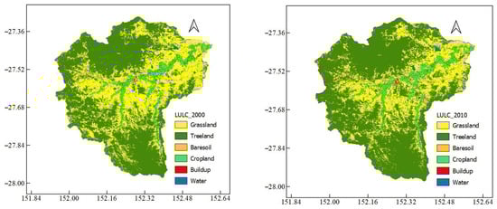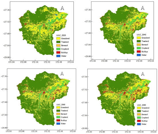 The SVM and RF for the year 2010 showed 89% (Kappa) and 91% (OA), and 79% (Kappa) and 82% (OA). In terms of individual class accuracy, the UA indicated 84% (SVM method) and 69% (RF method) for treeland, while the PA was 100% for both methods. The results of the OA (0.84) and Kappa (0.8) were the same in both the SVM and RF models for the year 2020. However, for the individual classification, which contains two classes (grassland and built-up), the SVM model generated a better user’s accuracy and producer’s accuracy. As can be observed from Table 6, RF outperformed SVM in the projection of landcover for the year 2020, and classified all six classes with a better accuracy than the SVM in terms of the Kappa, OA, and PA. The model incorporates spatial elements like distance from major roads, DEM, and population density to generate a map illustrating changes in land cover, revealing the evolving patterns within the Lockyer catchment (Figure 5).