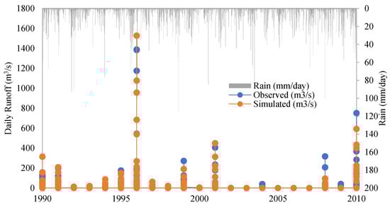 A comparison between the simulated and observed discharge is used to assess the results of the calibration and validation for the periods of 1990–2002 and 2003–2010, respectively (Figure 6 and Figure 7). The eight calibrated parameters are presented in Table 3. The model’s output data were calibrated and validated using the daily streamflow records from the 143210B Lockyer Creek at Rifle Range Road station as the outlet. As illustrated in Figure 2, the Lockyer catchment contains eighteen rainfall-gauging stations. The model utilised inputs consisting of the area’s average weighted daily evapotranspiration and rainfall from these 18 gauging stations, along with daily records of discharge from the Rifle Range Road station. The calibration and validation of the hydrologic model were carried out for the periods of 1990–2002 and 2003–2010, respectively. Streamflow data were utilised, allocating 60% for calibration and 40% for validation purposes. According to the results of Table 7 and Figure 6, the findings indicate the model’s effective performance and its reliable accuracy in estimating runoff.