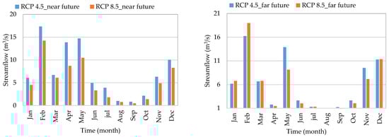 Runoff was projected to decline in January and February by 16% in the near future and 18% in the far future. Figure 8 illustrates that the significant increase in projected runoff in February is mostly caused by the increase in projected rainfall. Also, the RCP 8.5 scenario consistently showed lower projected streamflow compared to RCP 4.5 throughout each month. February displayed the greatest span of long-term average daily streamflow from 17.35 m3/s (RC P4.5) to 14.24 m3/s (RCP 8.5) in the near future and from 16.25 m3/s (RCP 4.5) to 18.99 m3/s (RCP 8.5) in the far future. This was followed by August, which had the lowest distinction from 1 m3/s (RCP 4.5) to 0.77 m3/s (RCP 8.5) in the near future and from 0.94 m3/s (RCP 4.5) to 0.95 m3/s (RCP 8.5) in the far future. It was also evident that, in comparison to the other months, November, December, January, February, and March are expected to receive relatively high long-term streamflow levels in both future periods. In conclusion, a further increase in greenhouse gas emissions will notably intensify the impact of increasing the amount of runoff [72] in some months in the future in the Lockyer catchment.