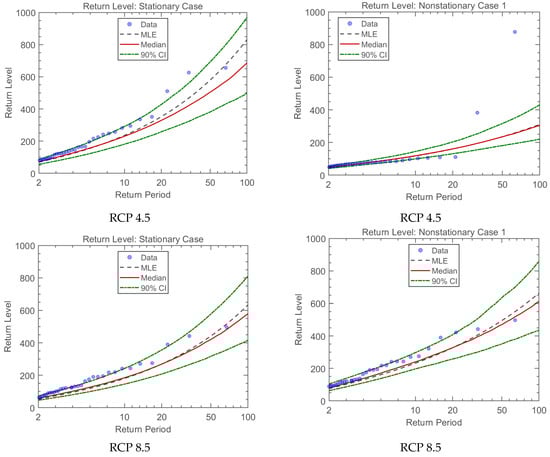 This research aims to investigate the non-stationary conditions of flood projected from the averaged ensemble of eight GCMs under the two scenarios RCP 4.5 and RCP 8.5 during future periods for 66 years. Figure 9 and Table 8 illustrate the return levels of maximum instantaneous flood for the study catchment. The ProNEVA software created streamflow return levels based on return periods spanning from 10 to 100 years under two non-stationary and stationary conditions. The greatest instantaneous flood under both stationary and non-stationary assumptions for the 2020–2086 future timeframe is illustrated in Figure 9 for 100 years beyond observations using the medians under the two RCP 4.5 and RCP 8.5 scenarios for various return durations.