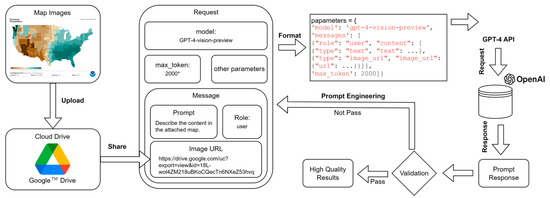Specifically, Figure 1 illustrates the process of using GPT-4V to read map images and make corresponding responses. Similarly, Gemini Pro API (Gemini Pro Vision, version 1.0, through generativeai package) and Sphinx API (http://llama-adapter.opengvlab.com, accessed on 20 February 2024 through gradio_client package) were used to test the map reading abilities of these LMMs. We opted for the GPT-4 API over the ChatGPT interface on the OpenAI webpage due to its ability to simultaneously recognize multiple images and monitor processing times. This study focused on evaluating the textual responses from GPT-4V (currently limited to text-only outputs). Despite Dall-E 3, OpenAI’s generative AI model on image generation, having the capability to produce image outputs, its limited image recognition abilities restrict its use in map reading and analysis [30], especially when compared to GPT-4V. Our experiments included a variety of map images sourced from both manually created maps, which were subsequently hosted and shared publicly on a cloud drive, and online map images from different hosting servers. Leveraging the fact that the GPT-4 API does not store uploaded files but can process image URLs, we chose Google Drive to host the tested images and created URLs accordingly. In the message sent to GPT API, the role parameter determines which contents should be pre-set in the model and which contents are user requests. The input information for GPT-4V in a request includes textual instructions (prompt) and images. In this study, we employed several types of requests to assess GPT-4V’s capabilities in map reading, which involves information retrieval, and in map analysis, which pertains to visual analytics.