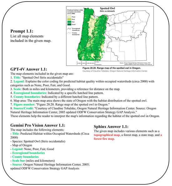 Prompt 1.1 and answers from three LMMs regarding to the map of spotted owls and its predicted habitats in Oregon, retrieved from [24], with proper answers highlighted in green, and incorrect answers highlighted in red.