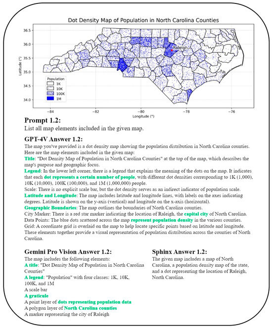 In Answer 1.1, GPT-4V explicitly described all the map elements that appeared on the map. Gemini Pro Vision also interpreted the figure correctly but with less information, such as missing the figure number and author name in the figure caption. Sphinx only described the map but gave a false interpretation of the figure. By checking the details of the answers, the descriptions from GPT-4V and Gemini Pro Vision were mostly accurate and correct, indicating their capabilities in extracting textual information from a map. Moreover, GPT-4V can link different elements to its use on the map. For example, it can first detect scales in two measurements and then explain that both scales (km and mile) provide a reference on the map. GPT-4V also interpreted the legend and explained how it works in layman’s terms, while Gemini Pro Vision only listed the elements without explanation.
