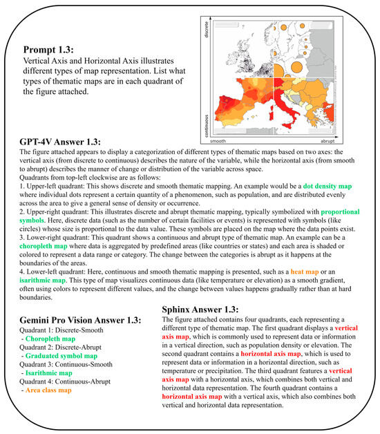 In addition, we tested the ability of LMMs to recognize different types of thematic maps using the same image set in Prompt 1.2 with the deliberate omission of their titles to focus purely on image interpretation capabilities. The results are summarized in Table 2 and reveal that GPT-4V accurately identified the symbology of 98 images, outperforming Gemini Pro Vision and Sphinx, which recognized 70 and 1 images, respectively. Based on the results above, GPT-4V exhibits a significant advantage in map reading, demonstrating exceptional performance that aligns with observations from other studies [32,33].