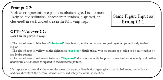Point pattern is one of the most common topics in map analysis. Point pattern analysis focuses on the spatial distribution of point data, usually including three types: clustered pattern, dispersed pattern, and random pattern. In this section, GPT-4V was tested for recognizing different types of point patterns. Figure 5, which indicates three types of point distribution, was retrieved from the book ‘Mapping, Society, and Technology’ [29]. Points in blue circles indicate clustered distribution, points in yellow circles indicate random distribution, and points in red circles represent dispersed distribution. In Prompt 2.2 (Figure 6), we directly test GPT-4V’s ability to distinguish between three types of point distribution. It turns out that point patterns in red and yellow circles cannot be recognized by GPT-4V. Considering that the map did not give any additional information on the colors of each circle, we conducted prompt engineering and added additional information explaining that each color of the circle represents a specific point distribution pattern. The response to our revised prompt (Prompt 2.2) was improved and could accurately point out each type of distribution. The step of adding additional information is also recommended in the official prompt engineering guide [31]. Thus, when given enough information, GPT-4V could recognize different types of point patterns and can be used to expedite data analysis.