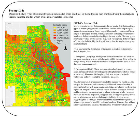 In addition to simple point pattern analysis, we also tested if GPT-4V can recognize different types of bivariate point patterns. Similar to previous prompts, we tested three types of bivariate point patterns, namely, clustered, regular, and random (Figure 7), using the figure from a relevant publication [34]. GPT-4V’s answer can correctly point out the most likely pattern for each point distribution. Additionally, GPT-4V uses its extensive language model to explain the characteristics of clustered, regular, and random distributions. Then, we used the crime and income data in Chicago as the case study (Figure 8). We collected point data from the crime dataset in Chicago and collected income data in each census block group. Then, we overlaid the selected two crime types (burglary and theft) on a graduated color map of income and tested if GPT-4V can recognize such a complex map. To our surprise, GPT-4V not only accurately described that the distribution of theft and burglary over the map is more concentrated in certain areas, but also gave a guess that theft data may be more related to income based on visual inspection. We later examined the result given by GPT-4V by calculating the Pearson correlation coefficient and p-value between the number of burglary/theft and income at the census block group level, and the result showed that GPT-4V’s guess was correct in that both correlations are significant, and theft has a stronger correlation with income than burglary (see Table S1).