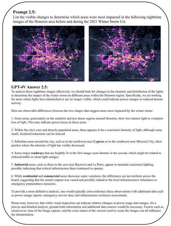 Prompt 2.5 and GPT-4V’s Answer regarding the map comparison between two NTL images in Houston on 7 February 2021 (before the winter storm) and 16 February 2021 (during the winter storm), NTL images retrieved from NASA (https://appliedsciences.nasa.gov/our-impact/news/extreme-winter-weather-causes-us-blackouts, accessed on 30 December 2023), additional insights identified by GPT-4V are highlighted in bold.