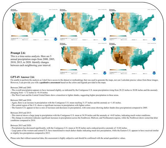 Extending the temporal scale from two to more, the test of time-series analysis on GPT-4V is conducted to evaluate its ability for visual detection of changes. We used the annual precipitation maps generated from the interactive mapping platform, Climate at the Glance, under the Climate Monitoring product provided by NOAA National Center for Environmental Information (NCEI) from 2000 to 2020 at a 5-year interval (i.e., 2000, 2005, 2010, 2015, 2020). Five maps were included in the message to GPT API by attaching URLs to their cloud location in Google Drive (Figure 10). Prompt 2.6 shows that GPT-4V can accurately provide a comprehensive qualitative assessment of the maps provided. Specifically, GPT-4V can provide the visual detection of changes between multiple map sets within a short amount of time, which is superior to human beings when reading multiple maps. Moreover, its outstanding ability of textual content extracting gives an additional correction for GPT-4V to understand and correct its answer to the prompt, like giving detailed changes in numbers shown on maps. As GPT-4V explained in its answer, it can only provide qualitative assessment (highlighted in bold in Figure 10) and may still lack accuracy in quantities. In most cases, data behind maps are rarely given simultaneously, making GPT-4V’s accurate qualitative assessment more valuable. However, without massive experiments for quality assurance and quality control, GPT-4V should be carefully applied when conducting a time-series analysis.