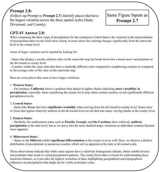 Spatial scale is important in spatial analysis, and comparison across different spatial scales can not only show a detailed view of spatial aggregation, but also address the modifiable areal unit problem (MAUP), one of the popular and important questions in geography, which is a statistical bias that can significantly affect the interpretation of data in geospatial analysis. Here, we tested GPT-4V’s ability to distinguish spatial patterns across different spatial scales in the same temporal scale. Similarly, maps in three spatial scales, i.e., state, divisional, and county, generated from Climate at the Glance under the Climate Monitoring product provided by NOAA NCEI, were collected and applied in Prompt 2.7 (Figure 11). GPT-4V’s answer illustrates that it can tell the differences in scales when comparing three maps, and the differences lead to a variation in resolution whereby maps with a smaller scale have a higher resolution. Specifically, it mentioned localized patterns in variability, which is a key component in the map comparison across three spatial scales. Thus, we followed up with Prompt 2.8 (Figure 12) to ask GPT-4V to identify which areas have the largest variability. The answer first provides a workflow on how to observe areas with the largest variability. Then, it gives some potential candidate states, like Texas, California, and Midwestern states, but it does not firmly confirm its observation on areas with the largest variability. The answer additionally introduced the concept of microclimates, which was absent from our original prompt, indicating that GPT-4V may use its pre-trained large language model to improve its map reading and analysis results. By following up with specific questions, GPT-4V can provide a relatively vague answer and phrases its answer with high uncertainties, like using “seems”, “relatively”, “might not”, etc. Overall, GPT-4V could distinguish differences across spatial scales, but its assessment on maps stays preliminary and qualitative.