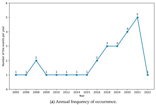The inventoried UGC events correspond to the period of May 2005–May 2022 and consist of 27 events with known locations and dates derived from recognition results, attribute extraction results, and co-reference filtering results (Table 3). Annual and monthly UGC frequency (number of events per year and per month) is depicted in Figure 5a,b, respectively, and a statistical representation of the known collapse area for the UGC inventories is given in Figure 5c.
