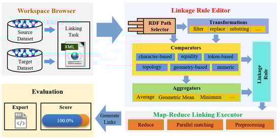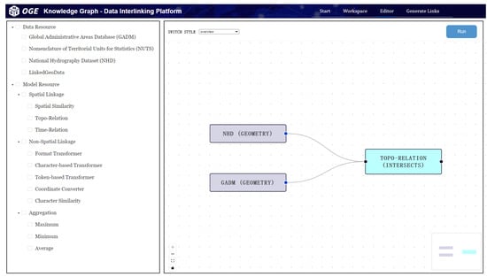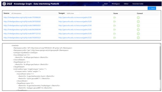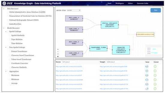 The OGE represents a comprehensive platform dedicated to the analysis of large-scale spatial–temporal data. The OGE-KG Data Interlinking Workbench, embedded within the overarching framework of the OGE knowledge graph, is a Web application that enables users to create links between two datasets in an interactive way. It provides three components: workspace browser, linkage rule editor, and evaluation. The workspace component provides a tree view of all projects and allows users to customize data sources and link tasks for each project. The linkage rule editor is a graphical interface that enables users to generate linkage rules by dragging and dropping its built-in operators (transformations, comparators, and aggregators). The evaluation component allows users to evaluate the links generated by the current linkage rule.