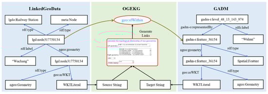 Setting geospatial links within the geospatial LOD is also hindered by the variety of encoding methods. When generating geometry literals, triple store vendors may choose either WKT serialization or GML serialization. These two serializations have different geometry types. Some datasets employ WKT geometry types (e.g., GADM) to implement their geospatial triple stores and some use GML geometry types (e.g., Ordnance Survey datasets), while others use both of them (e.g., NHD). These varieties prevent geometry literals from being compared easily by spatial operators in the OGE-KG framework. Therefore, the transformation of geometry literals is needed in the OGE-KG framework to make it applicable to more geospatial datasets.