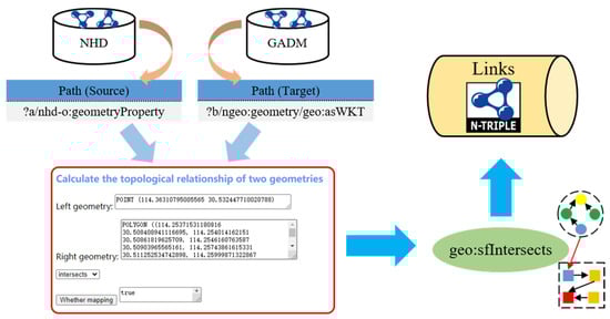 Some efforts have studied the interconnection of linked geospatial data by extending linking criteria from the general information domain, such as a hybrid use of distance and semantic criteria [29,30,31]. A geographic entity can be described using either a geographical name in the text form or a geographical feature with location represented in coordinates. Both spatial scores and name similarity scores can then be calculated using various distance algorithms, including Jaco-Winkler [32], to determine the linkage of entities, such as the “owl:sameAs” relationship. In some cases, distance computation may be employed to establish relationships such as “nearBy” between two geographical features. In the LinkedGeoData, datasets (e.g., roads and lakes) are interlinked at the feature level using different distance measures. In addition, topological relations among geospatial features can be determined and presented as links. For example, some efforts employ the topological predicate, “spatial:EQ”, to integrate the NUTS and GADM datasets [33,34]. Ma [35] describes conversion from vector objects and raster data to RDF. Vector data are encoded in Geography Markup Language (GML), from which topological relations are pre-computed and then converted into RDF triples.