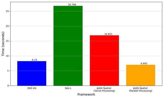In this case, we first conducted tests of “Within” relation associations with Geo-L and JedAI-spatial (serial version) in the same environment using datasets of 165,000 Smart Points of Interest (SPOI) entities and 1782 NUTS entities as used in paper [11]. The comparative results are shown in Figure 8. In the OGE-KG program, the discovery process takes approximately 8 s, while Geo-L requires about 26 s, noting that this process only tests the mapping stage. Due to the use of the R-Tree-over-GiST index for managing geometric data in PostGIS during the data preprocessing stage, Geo-L can significantly improve association efficiency during the mapping stage. Compared to Geo-L, JedAI-spatial achieves higher association efficiency by incorporating not only tree-based algorithms but also grid-based and partition-based filters. However, according to the time-consuming results, MapReduce still maintains its processing advantage for large datasets. Additionally, OGE-KG’s processing time is slightly inferior to that of JedAI-spatial with the parallel scheme. This is due to its indexing filters effectively reducing computational overhead during the joining stage, although it requires configuring extra indices and grids for repartitioning during the preprocessing stage. Nevertheless, our framework still achieves efficient performance improvements.