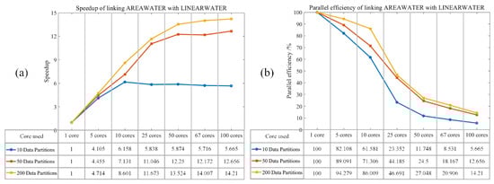 Performance evaluation with different computing resources: (a) speedup and (b) parallel efficiency.