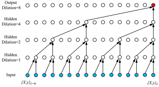 As depicted in Figure 2, the TCN model [19] is built upon the CNN architecture and employs causal convolutions to suit sequential modeling. It employs dilated convolutions and residual blocks to capture historical memory. A TCN employs a one-dimensional convolutional network. The TCN architecture employs causal and dilated convolutions, where the value at time t for each layer depends solely on the values of the previous layer at time t, t−1, etc., revealing the characteristics of causal convolution. Moreover, the information extracted from each layer to the preceding layer is skip-connected, and the dilation rate increases exponentially by a factor of two per layer, highlighting the attributes of dilated convolution. Owing to the adoption of dilated convolutions, padding (typically zero-padding) is required for each layer, where the padding size is .