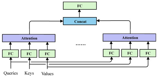 As shown in Figure 4, by designing an attention mechanism with h heads, we can independently train h sets of different linear projections to transform the items to be queried (queries) or stored (keys) in the network, as well as specific pieces of information kept in the memory (values). Subsequently, these h sets of transformed queries, keys, and values are concurrently subjected to attention pooling. Finally, the h attention pooling outputs are concatenated and transformed through another learnable linear projection to generate the final output.