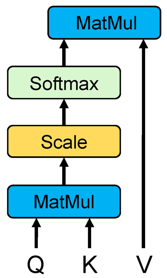 Furthermore, it is noteworthy that the scaled dot-product attention is tantamount to a normalized version of the dot-product attention. In essence, given that the input matrices Q and K are of dimension and V is of dimension , the operation executes the matrix multiplication of Q and each K, scales the product by , and thereafter applies the softmax function to ascertain the weights. The output matrix is articulated as follows [22]: