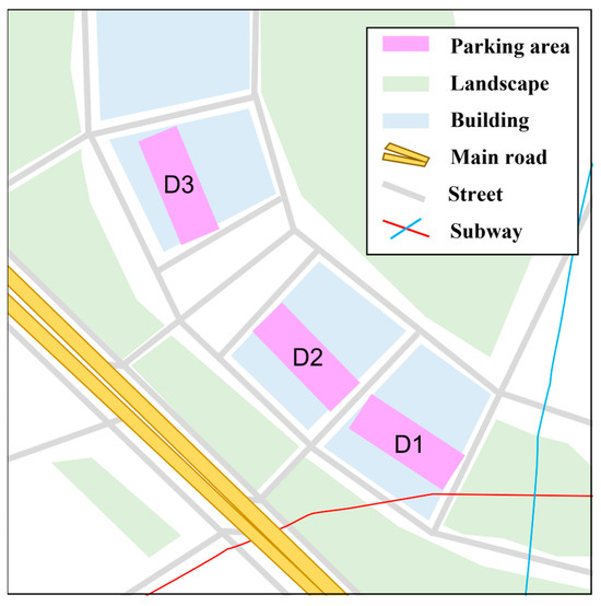 In this study, three representative parking lots, labeled D1, D2, and D3, were selected as research subjects. These parking lots are categorized as small- and medium-sized closed off-road facilities, with parking capacities of 157, 132, and 151, respectively. As illustrated in Figure 6, the three parking lots are situated adjacent to each other; however, the data regarding the NAP vary due to differences in geographical locations and surrounding public amenities. Consequently, the three datasets can be cross-referenced.
