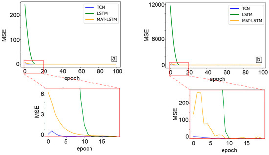 Convergence curves for TCN, LSTM, and MAT-LSTM (Dataset D1): (a) comparison of validation set MSE curves and (b) comparison of test set MSE curves.