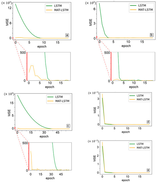Figure 9. Error curves for LSTM and MAT-LSTM: (a) Dataset D1; (b) Dataset D2; (c) Dataset D3; (d) Dataset S5; and (e) Dataset S10. - MAT-LSTM required more computational time. The addition of MAT increased the computational workload, increasing the time for each training cycle. As indicated in Table 5, MAT-LSTM consumed 16% more training time per cycle than LSTM for the D1, D2, and D3 datasets, and 20% more for the S5 and S10 datasets.