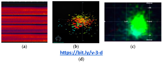 The data processing, restitution and analysis of urban soundscapes are based on a combination of interactive psychoacoustic and acoustic data integration processes applied to the specific places selected in the urban environment. The restitution methods selected for the modelling of soundscape environments respectively identify the acoustic and psychoacoustic characteristics. The first approach, derived from signal processing, is based on a spectrogram that gives a time/frequency visual representation of a sound signal amplitude valued by intensities (Figure 2a: yellow for a high amplitude to red and black for no signal). Such a sound signal gives the morphology frequency wherein interpretation is conducted according to specific known properties of the environment. For implementation purposes, O3A Flare (Figure 2c), one of the main plug-in libraries of “Blue Ripple Sound” has been applied. It gives an ambisonic 3D representation of superior order, whose interest is to reflect the extent of the sound variability in a three-dimensional space [55]. The second sensor used, NX Virtual Mix Room (Ambisonics Quad), from the WAVES family of plug-ins, is a real-time analysis system that represents the direction of sounds in Ambisonics channels (Figure 2b). The directional components of the interpreted sounds are projected onto a sphere, which retains the spatial dimension and the cardinal directions, azimuths and elevations. Figure 2d gives an interactive link by QR code to a video for an illustration of a visual interpretation.