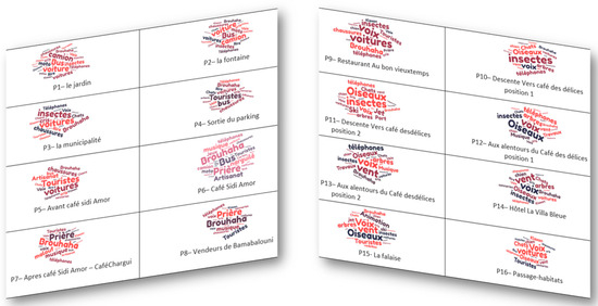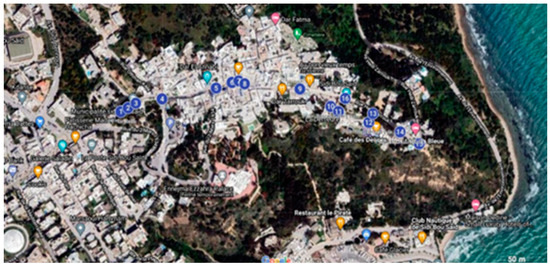 Sidi Bou Said is a small city in northern Tunisia 20 kilometers northeast of the capital with about 6000 inhabitants. It is a rich historical place with an urban route that takes place on a progression of alleys including two ancient cafes, a wealth of heritage, several craft shops with hotels and restaurants nearby and a cliff overlooking the sea and the marina; we have chosen 16 measurement and experimentation locations (Figure 5). Before the start of the measurement campaign, several in situ acoustic surveys were carried out over the two days preceding the experiments and measurements, to immerse ourselves in the location. First, 360° videos were made for a realistic reproduction of the place and these routes. Secondly, continuous measurements were taken at the center of the route, which is rich in heritage, that is, two historic cafes and the Zaouïa (place of worship). This experiment was carried out in two days for a total recording time of 19 h and 30 min and 132 sound “accidents” were recorded during the entire investigation period of 1170 min. Our investigation followed the following temporal plan (Figure 6). This preliminary investigation allowed us to highlight the taxonomy and sound characteristics of the urban environment (Figure 7).
