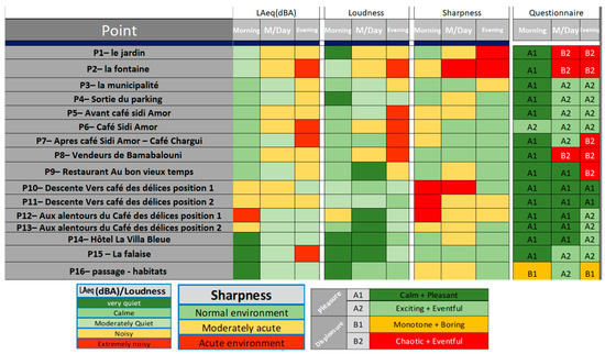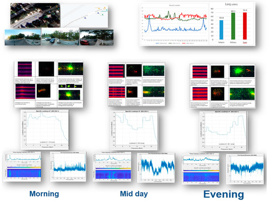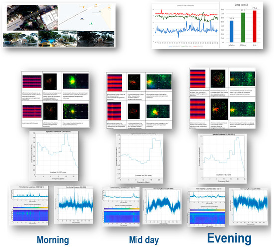 After establishing the methodological framework, this section presents the implementation of the proposed approach through a case study conducted in the Tunisian city of Sidi Bou Said. The experimental design follows a systematic protocol to collect complementary soundscape data across multiple locations in the urban environment. Both quantitative measurements and qualitative surveys are carried out to characterize the soundscapes from various perspectives. The results are structured to first illustrate findings from select representative points of interest across the three daily periods—morning, midday, and evening. Following these specific examples, the section summarizes the acoustic, psychoacoustic and perceptual measurements for all locations through graphical analysis. Finally, the measured quantitative soundscape properties are compared and contrasted with the human subjective evaluations to reveal key similarities and differences between the objective and perceived soundscapes. The case study provides a practical demonstration of the multidimensional framework for soundscape assessment proposed in this research.