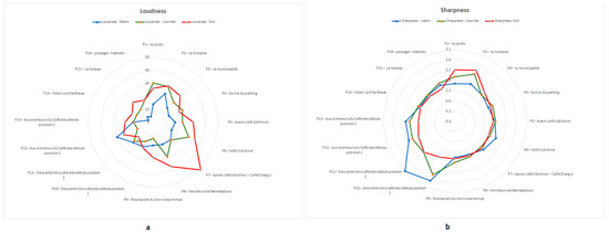 The substantial amount of recent works on the modelling and interpretation of sound environments has enabled the implementation of ISO standards combining soundscapes and psychoacoustics [50,56,57,58]. This provides a reference for data collection, while ISO 1293-1 [3] gives sound support for conceptualizing the relation between psychoacoustics, acoustics and human perceptions. Among the different soundscape metrics identified, two important ones are loudness and sharpness. The loudness evaluates the energy impact on humans from an acoustic point of view; it denotes the sound level perceived on a linear scale and is fixed by the ISO 532-1 standard [59]. Sharpness measures the sensation caused by high frequencies contained in noise and implies whether its high-frequency components are likely to affect humans or not [60]. These two metrics are particularly appropriate for a psychoacoustic analysis of urban sound environments. Other specific indices such as sound fluctuations over time or roughness for rapid variations are not retained for our approach but could be explored in further work. Several diagrams (Figure 3) highlight the specific outputs generated by sharpness and loudness properties. The three sub-figures in Figure 3 illustrate different aspects of the psychoacoustic analysis. Figure 3a shows the specific loudness (N) as defined by ISO 532-1 [59], which represents the loudness distribution across different frequency bands. Figure 3b displays the time-varying loudness, also defined by ISO 532-1, indicating how the overall loudness changes over time. Figure 3c presents the time-varying sharpness, as defined by DIN 45692 [61], which describes the high-frequency content of the sound and its evolution over time. Together, these diagrams provide a comprehensive view of the psychoacoustic characteristics of the analyzed soundscapes and a detailed interpretation of their perceptual properties.