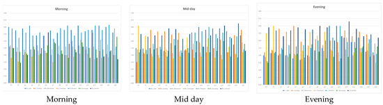 The outputs of the first location are presented throughout the three periods: morning/middle of the day and evening (Figure 10). The respective acoustics, psychoacoustics and three-dimensional analysis are given. One can notice that in the middle of the day and the evening, the environment is relatively noisy. At the top of the diagram, one can observe some sound accidents visible with the green color while showing their spatial location. Psychoacoustics gives us additional information, such as for the middle of the day where sharpness denotes an acute environment due to the presence of insects.