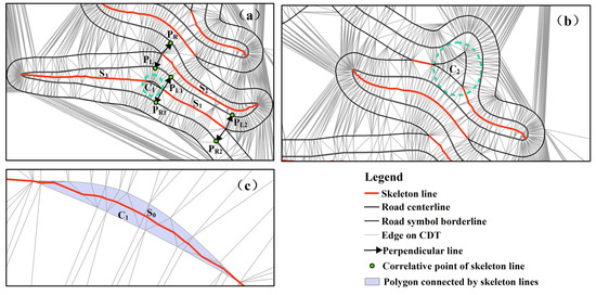 A polygon enclosed by a road symbol borderline may be connected with two skeleton lines, for example, polygon C1 in Figure 3a and polygon C2 in Figure 3b. If the area of this polygon is less than the area threshold, then the main skeleton line of this polygon must be extracted [10,17], and this main skeleton line must be connected with two other skeleton lines connected to this polygon to form a complete skeleton line, such as skeleton line S0 in Figure 3c. If the area of the polygon is greater than the area threshold, then the main skeleton line of this polygon cannot be extracted, as shown in Figure 3b.