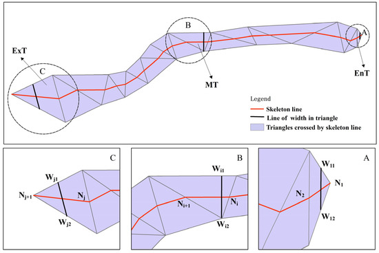 where, represents the length of the line connecting point Ni and point Ni+1 in a triangle, and 1≤ i ≤ j, where j represents the number of triangles crossed by the skeleton line. For example, as shown in Figure 4, N1 and Nj+1 represent the vertex of EnT and ExT in A and B, respectively; N2, Ni, Ni+1, and Nj represent the midpoint of the edges of EnT, MT, and ExT in A, B, and C, respectively,