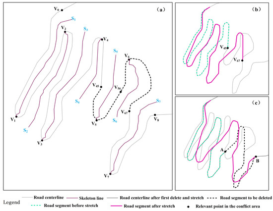 To maintain the graphic characteristics of the remaining road segments in the group conflict area, the snake displacement model [17] is used to stretch these segments. The stretching direction is determined by comparing the values of the two road segments on either side of the deleted road segment. If the value of one road segment (RS) is larger than the other, the direction of the stretch is from the road segment (RS) to the other road segment. For example, the stretching direction is from V45 to V67 in Figure 7b. Sometimes only one collaboration between the deletion operation and the snake displacement model is not sufficient to meet the requirement of resolving a graphic conflict; therefore, the collaboration must be used several times, and the number of iterations (Nit) of this collaboration can be calculated with Formula (7). For example, Figure 7c is the result after the second collaboration, where the stretching direction is from point A to point B: